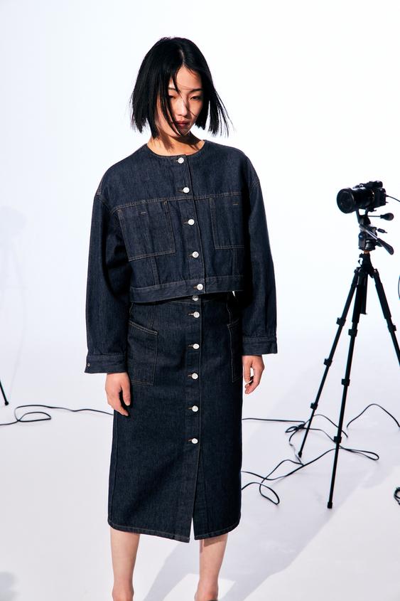 濃いめカラーのデニム素材は品があり、オフィスカジュアルにもおすすめ。