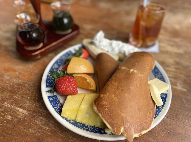 現在の「パンケーキ」よりは、薄めの「ホットケーキ」という味わいで、たっぷりのフルーツが添えられているのが特徴。