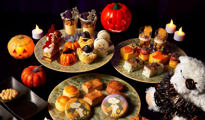 「グランドプリンスホテル新高輪」の1階にあるラウンジMomijiでは、黒猫と月をテーマにしたハロウィンアフタヌーンティーを楽しめます。